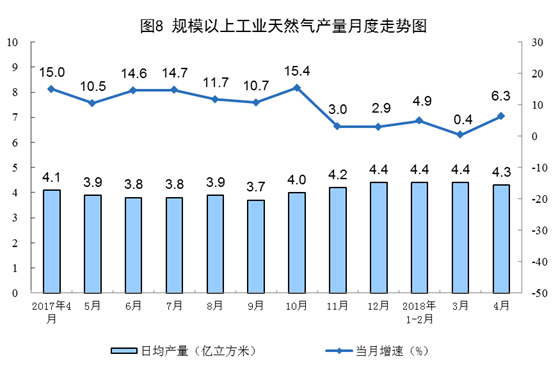 4月份,天然氣生產(chǎn)保持高位,產(chǎn)量128.9億立方米,同比增長6.3%,增速比上月加快5.9個百分點;日均生產(chǎn)4.3億立方米,比上月減少0.1億立方米。