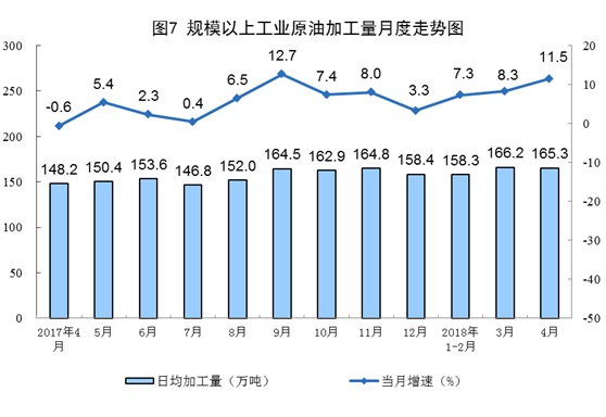 受去年同期大型石化企業(yè)停產(chǎn)檢修較多,以及今年原油進口配額和成品油出口配額均大幅增加等多重因素影響,原油加工量增長較快。4月份,原油加工量4958萬噸,同比增長11.5%,比上月加快3.2個百分點;日均加工165.3萬噸,比上月減少0.9萬噸。