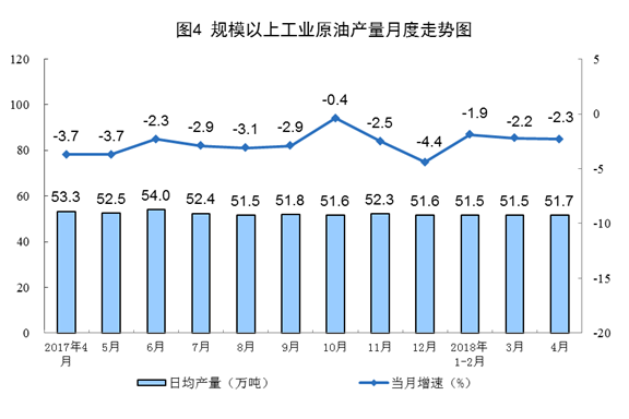 4月份,原油生產(chǎn)1551萬噸,同比下降2.3%,降幅比上月擴大0.1個百分點;日均產(chǎn)量51.7萬噸,比上月增加0.2萬噸。