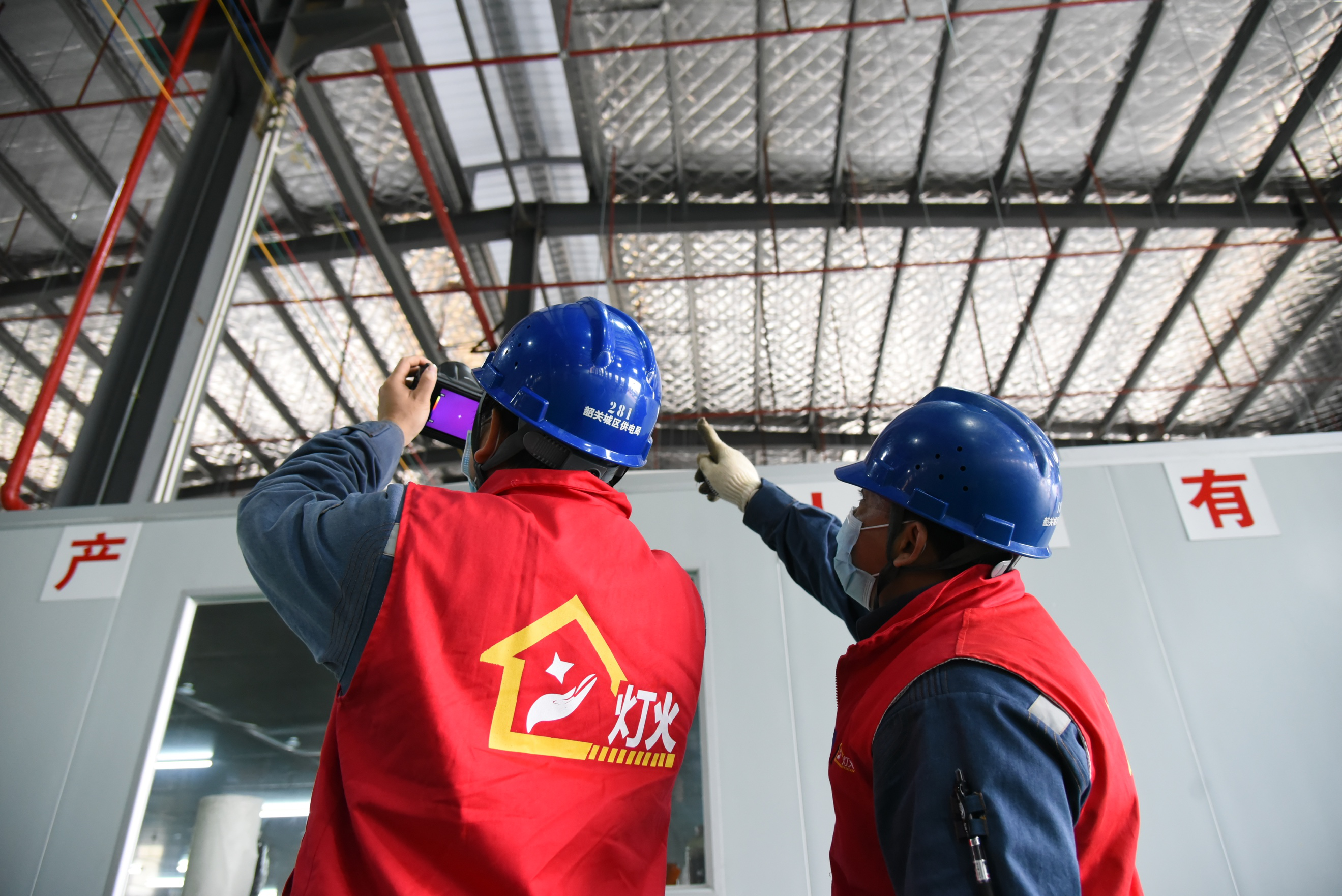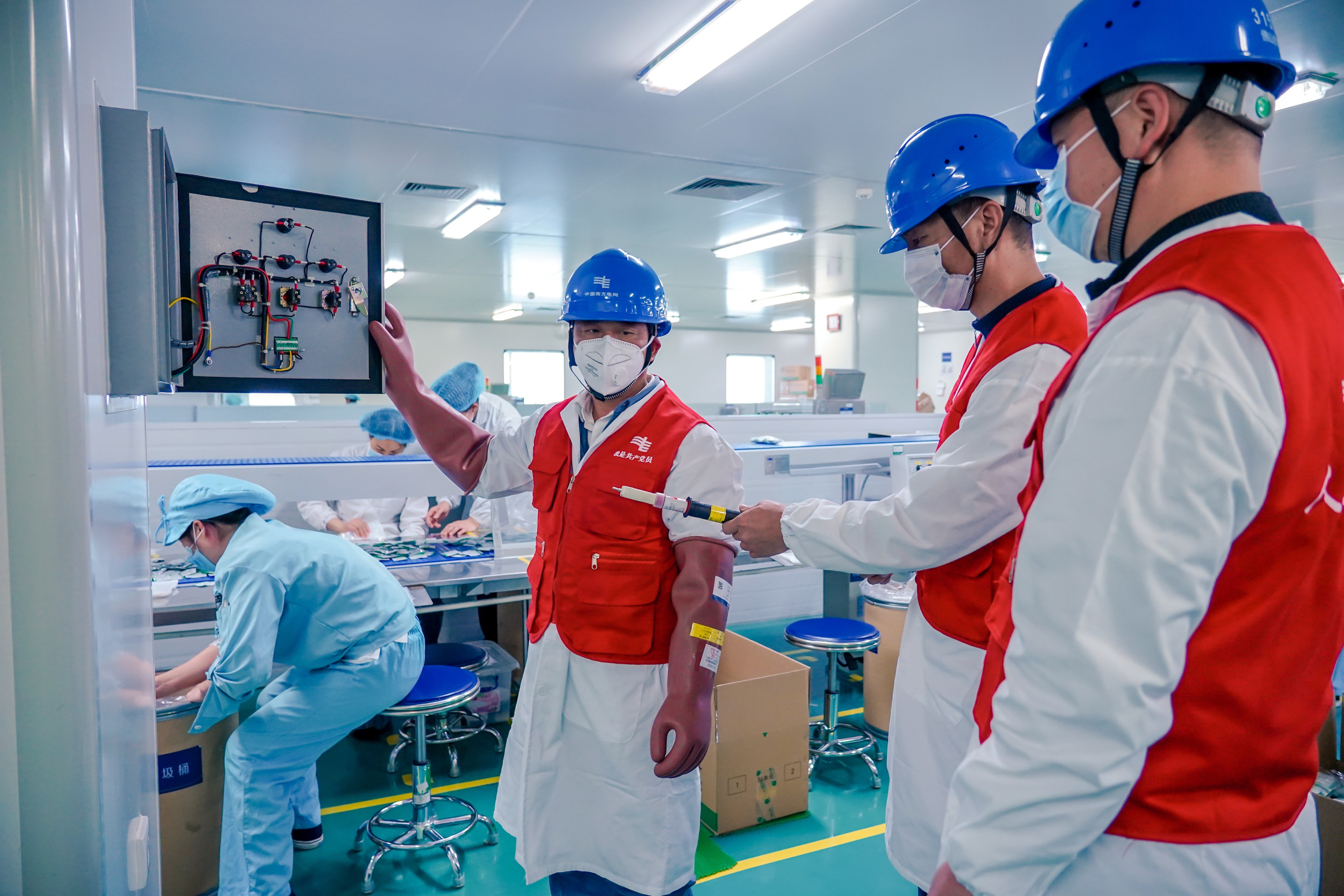 南方電網(wǎng)廣東佛山南海供電局里水供電所組織黨員服務(wù)隊(duì)深入廣東一方制藥有限公司檢查供電線路設(shè)備,為戰(zhàn)“疫”企業(yè)用電生產(chǎn)保駕護(hù)航。(李熾權(quán) 攝)