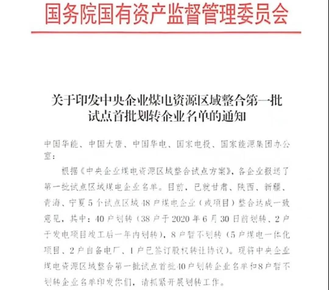 中國(guó)電力網(wǎng)訊 5月20日,國(guó)資委向五大發(fā)電集團(tuán)下發(fā)了《關(guān)于印發(fā)中央企業(yè)煤電資源區(qū)域整合第一批試點(diǎn)首批劃轉(zhuǎn)企業(yè)名單的通知》(下稱(chēng)《通知》)。中國(guó)華能、中國(guó)大唐、中國(guó)華電、國(guó)家電投、國(guó)家能源集團(tuán)根據(jù)《中央企業(yè)煤電資源區(qū)域整合試點(diǎn)方案》,將在甘肅、陜西、新疆、青海、寧夏5個(gè)試點(diǎn)區(qū)域開(kāi)展第一批試點(diǎn)。第一批試點(diǎn)共涉及48戶(hù)煤電企業(yè)(或項(xiàng)目),其中,38戶(hù)將于2020年6月30日前劃轉(zhuǎn)、2戶(hù)于發(fā)電項(xiàng)目竣工后一年內(nèi)劃轉(zhuǎn)、8戶(hù)暫不劃轉(zhuǎn)(5戶(hù)煤電一體化項(xiàng)目、2戶(hù)自備電廠(chǎng)、1戶(hù)已簽訂股權(quán)轉(zhuǎn)讓協(xié)議)。