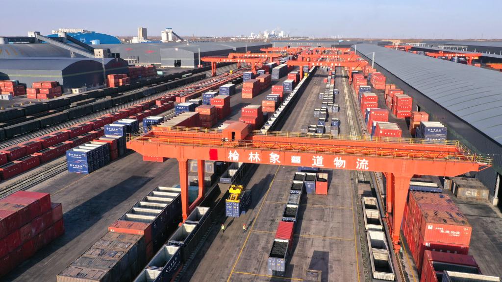 在榆林象道國(guó)際物流園集裝箱裝卸區(qū),工作人員在指揮裝卸外運(yùn)煤炭(無(wú)人機(jī)照片)。新華社記者 陶明 攝