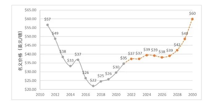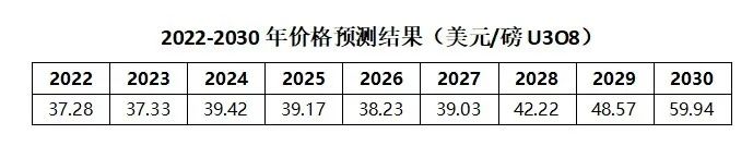 報告還對2022-2030年天然鈾現(xiàn)貨價格作了預(yù)測。之所以選擇對長期現(xiàn)貨價格進(jìn)行預(yù)測,是因為該價格是反應(yīng)市場供需關(guān)系的主要指標(biāo),是長貿(mào)協(xié)議引用的重要指數(shù),且不易受到短期市場投機行為的影響。