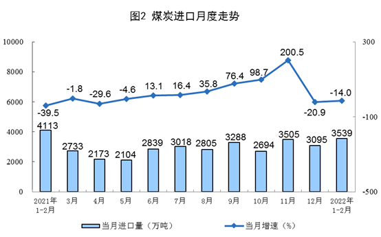 原煤生產(chǎn)較快增長,進口降幅收窄。1—2月份,生產(chǎn)原煤6.9億噸,同比增長10.3%,增速比上年12月份加快3.1個百分點,日均產(chǎn)量1164萬噸。進口煤炭3539萬噸,同比下降14.0%,降幅比上年12月份收窄6.9個百分點。