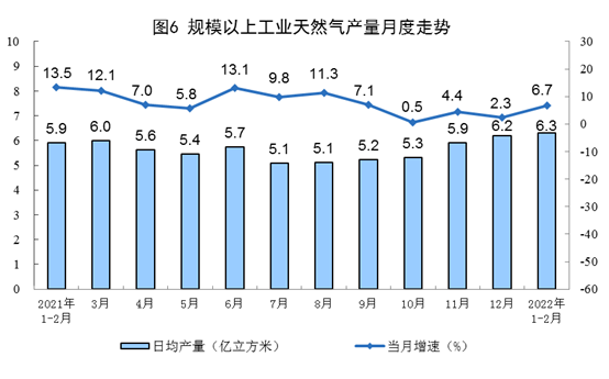 天然氣生產(chǎn)保持增長,進口下降。1—2月份,生產(chǎn)天然氣372億立方米,同比增長6.7%,增速比上年12月份加快4.4個百分點,日均產(chǎn)量6.3億立方米。進口天然氣1986萬噸,同比下降3.8%,上年12月份為增長4.6%。