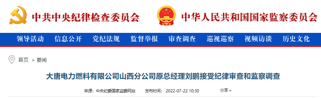 中央紀(jì)委國(guó)家監(jiān)委網(wǎng)站7月22日消息,據(jù)中國(guó)大唐集團(tuán)有限公司紀(jì)檢監(jiān)察組、山西省監(jiān)察委員會(huì)消息:大唐電力燃料有限公司山西分公司原總經(jīng)理劉鵬涉嫌嚴(yán)重違紀(jì)違法,目前正接受中國(guó)大唐集團(tuán)有限公司紀(jì)檢監(jiān)察組紀(jì)律審查和山西省太原市監(jiān)察委員會(huì)監(jiān)察調(diào)查。