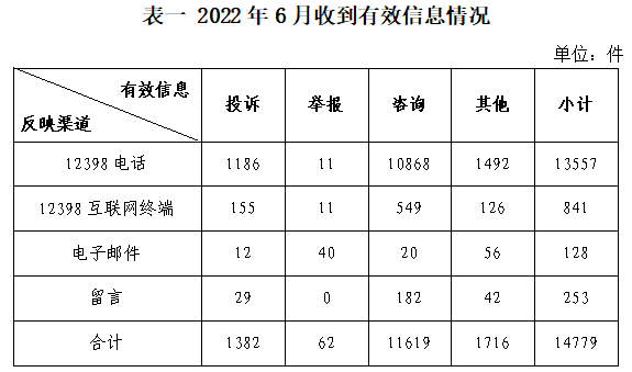 2022年6月,國家能源局12398能源監(jiān)管熱線(以下簡(jiǎn)稱12398熱線)共收到有效信息14779件(包含投訴、舉報(bào)、咨詢和其他訴求類別),環(huán)比增加43.12%,同比增加49.28%。(2022年6月收到有效信息情況見表一)