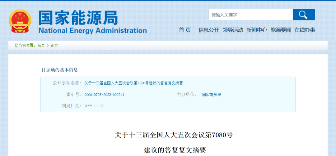 11月2日,國家能源局發(fā)布《關(guān)于十三屆全國人大五次會議第7080號建議的答復(fù)復(fù)文摘要》。