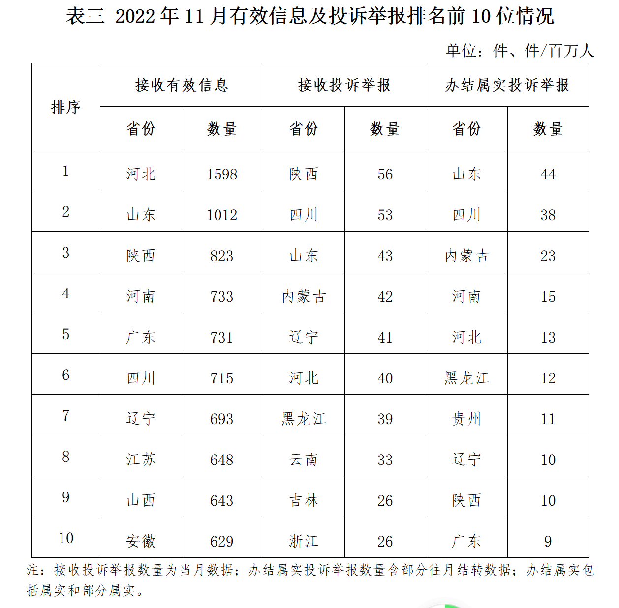 各省(自治區(qū)、直轄市)按照接收的有效信息數(shù)量排序,河北、山東、陜西、河南、廣東、四川、遼寧、江蘇、山西、安徽排在全國(guó)前10位;按照接收的投訴舉報(bào)數(shù)量排序,陜西、四川、山東、內(nèi)蒙古、遼寧、河北、黑龍江、云南、吉林、浙江排在全國(guó)前10位;按照辦結(jié)屬實(shí)的投訴舉報(bào)數(shù)量排序,山東、四川、內(nèi)蒙古、河南、河北、黑龍江、貴州、遼寧、陜西、廣東古排在全國(guó)前10位。(2022年11月有效信息及投訴舉報(bào)排名前10位情況見(jiàn)表三)
