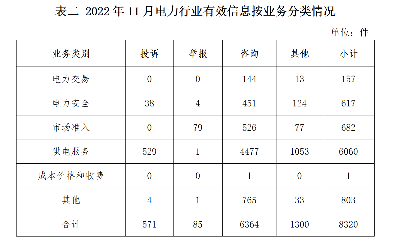 電力行業(yè)排在首位,有效信息數(shù)量為8320件,占全部有效信息的60.22%。群眾關(guān)注的內(nèi)容主要集中在供電服務(wù)、電力安全、市場(chǎng)準(zhǔn)入等方面。(2022年11月電力行業(yè)有效信息按業(yè)務(wù)分類情況見(jiàn)表二)