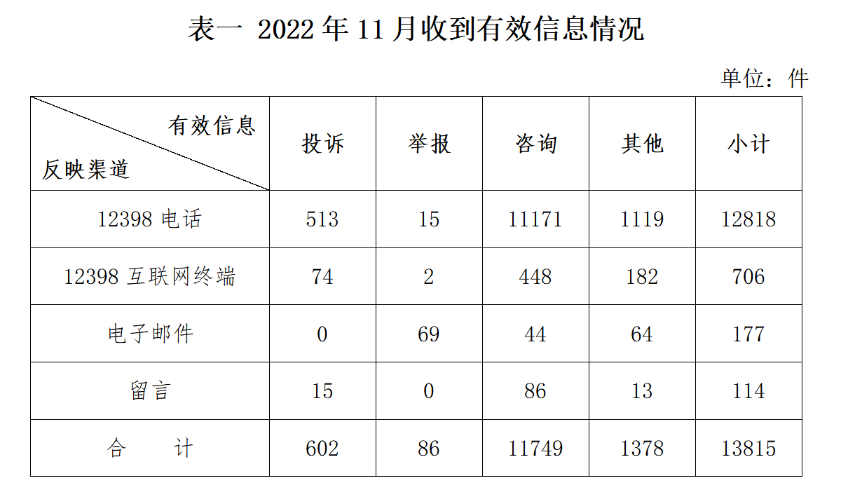 2022年11月,國(guó)家能源局12398能源監(jiān)管熱線(以下簡(jiǎn)稱12398熱線)共收到有效信息13815件(包含投訴、舉報(bào)、咨詢和其他訴求類別),環(huán)比增加4.36%,同比增加6.82%。(2022年11月收到有效信息情況見(jiàn)表一)
