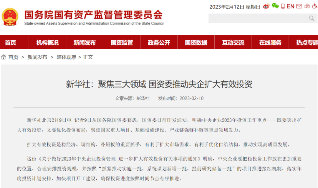 日前,國務(wù)院國資委印發(fā)《關(guān)于做好2023年中央企業(yè)投資管理 進(jìn)一步擴(kuò)大有效投資有關(guān)事項的通知》(以下簡稱《通知》),明確中央企業(yè)2023年投資工作三大重點領(lǐng)域:國家重大項目、基礎(chǔ)設(shè)施建設(shè)、產(chǎn)業(yè)鏈強(qiáng)鏈補(bǔ)鏈。