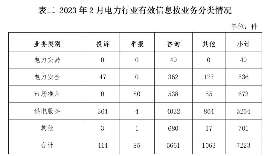 電力行業(yè)排在首位,有效信息數(shù)量為7223件,占全部有效信息的70.37%。群眾關注的內(nèi)容主要集中在供電服務、電力安全、成本價格和收費等方面。(2023年2月電力行業(yè)有效信息按業(yè)務分類情況見表二)