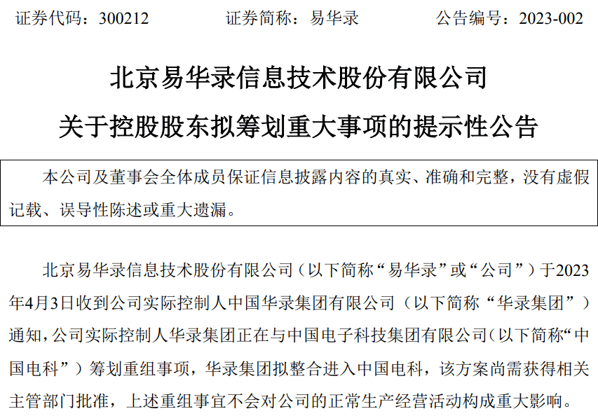 4月3日,北京易華錄信息技術(shù)股份有限公司發(fā)布公告稱,收到公司實(shí)際控制人中國華錄集團(tuán)有限公司(以下簡稱“華錄集團(tuán)”)通知,華錄集團(tuán)正在與中國電子科技集團(tuán)有限公司(以下簡稱“中國電科”)籌劃重組事項(xiàng),華錄集團(tuán)擬整合進(jìn)入中國電科。易華錄表示,該方案尚需獲得相關(guān)主管部門批準(zhǔn),上述重組事宜不會(huì)對(duì)公司的正常生產(chǎn)經(jīng)營活動(dòng)構(gòu)成重大影響。公司將按照法律法規(guī)的要求及時(shí)披露進(jìn)展情況。