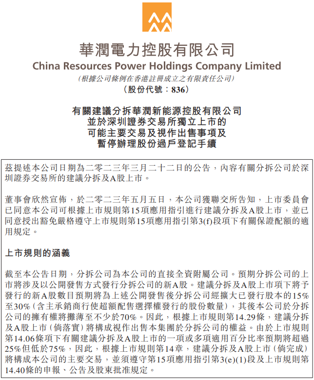 6月18日,華潤電力發(fā)布《有關(guān)建議分拆華潤新能源控股有限公司并于深圳證券交易所獨立上市的可能主要交易及視作出售事項及暫停辦理股份過戶登記手續(xù)》。