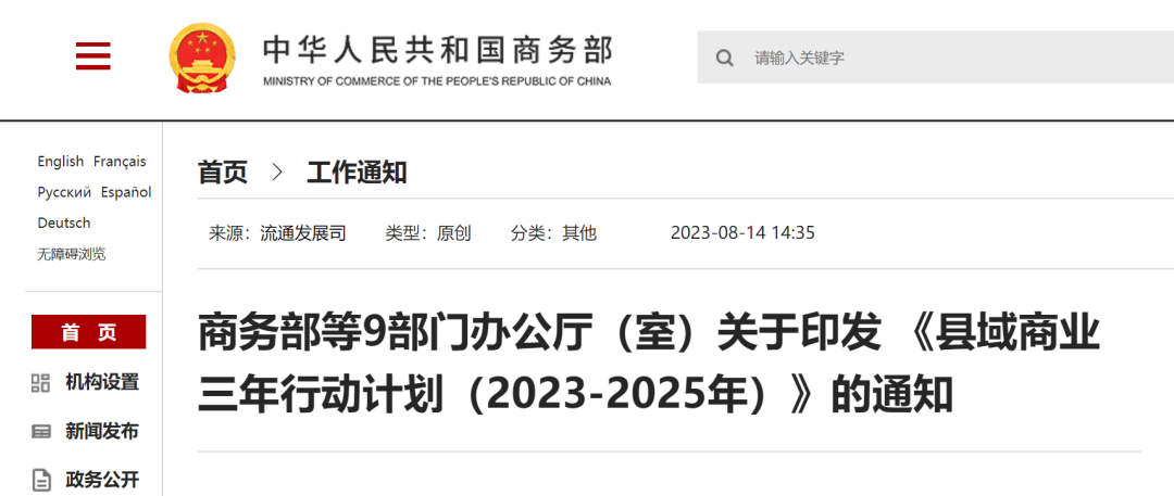 8月14日,商務(wù)部等9部門辦公廳(室)發(fā)布關(guān)于印發(fā) 《縣域商業(yè)三年行動(dòng)計(jì)劃(2023-2025年)》(以下簡稱《計(jì)劃》)的通知。