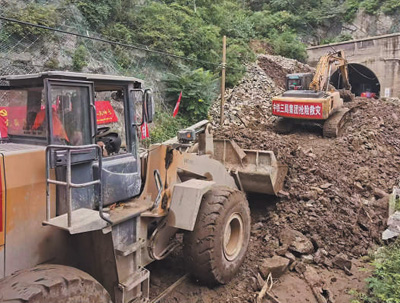中國中鐵三局救援隊(duì)清理隧道洞口泥沙,搶修豐沙線。