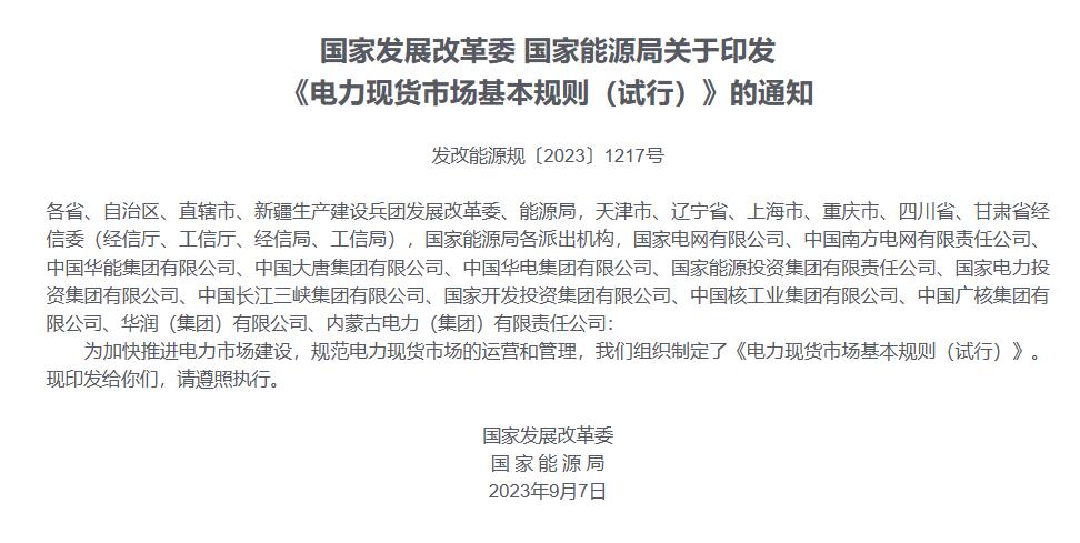 據國家發(fā)改委網站9月18日消息,國家發(fā)改委、國家能源局發(fā)布關于印發(fā)《電力現貨市場基本規(guī)則(試行)》的通知。