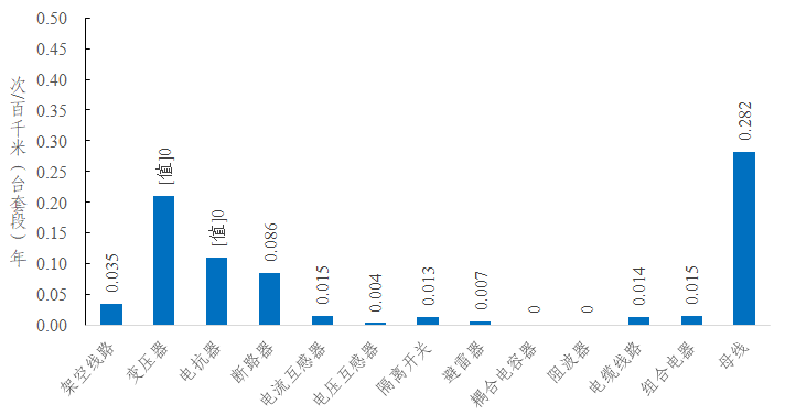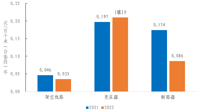 2022年,架空線路的強(qiáng)迫停運(yùn)率為0.035次/百千米年,同比減少0.011次/百千米年。變壓器的強(qiáng)迫停運(yùn)率為0.210次/百臺年,同比增加0.013次/百臺年。斷路器的強(qiáng)迫停運(yùn)率為0.086次/百臺年,同比減少0.088次/百臺年。