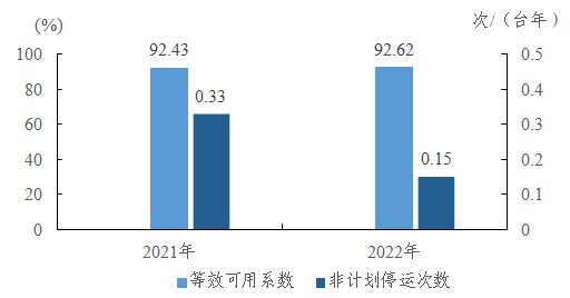 10萬千瓦及以上燃?xì)?蒸汽聯(lián)合循環(huán)機(jī)組等效可用系數(shù)92.62%,同比增加0.19個(gè)百分點(diǎn);非計(jì)劃停運(yùn)0.15次/臺年,同比下降0.18次/臺年。
