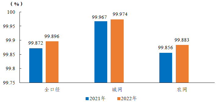 2022年,全國用戶平均供電可靠率99.896%,同比上升0.025個(gè)百分點(diǎn),其中,城網(wǎng)99.974%,農(nóng)網(wǎng)99.883%。城網(wǎng)與農(nóng)網(wǎng)相差0.091個(gè)百分點(diǎn)。