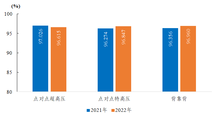 2022年,納入電力可靠性統(tǒng)計(jì)的點(diǎn)對點(diǎn)超高壓直流輸電系統(tǒng)能量可用率為96.615%,同比下降0.411個(gè)百分點(diǎn);點(diǎn)對點(diǎn)特高壓直流輸電系統(tǒng)能量可用率為96.847%,同比上升0.573個(gè)百分點(diǎn);背靠背直流輸電系統(tǒng)能量可用率為96.960%,同比上升0.604個(gè)百分點(diǎn)。