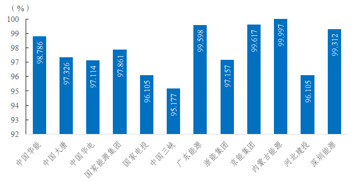 2022年,發(fā)電側(cè)12家集團(tuán)公司變壓器可用系數(shù)前三位分別是內(nèi)蒙古能源集團(tuán)有限公司99.997%、北京能源集團(tuán)有限責(zé)任公司99.617%、廣東省能源集團(tuán)有限公司99.598%。