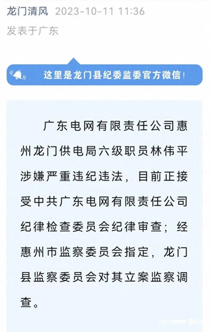 廣東電網(wǎng)有限責(zé)任公司惠州龍門供電局六級(jí)職員林偉平涉嫌嚴(yán)重違紀(jì)違法,目前正接受中共廣東電網(wǎng)有限責(zé)任公司紀(jì)律檢查委員會(huì)紀(jì)律審查,經(jīng)惠州市監(jiān)察委員會(huì)指定,龍門縣監(jiān)察委員會(huì)對(duì)其立案監(jiān)察調(diào)查。