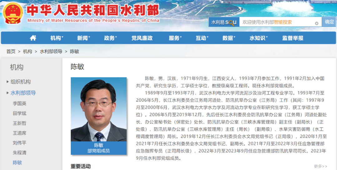 陳敏已任水利部黨組成員。
