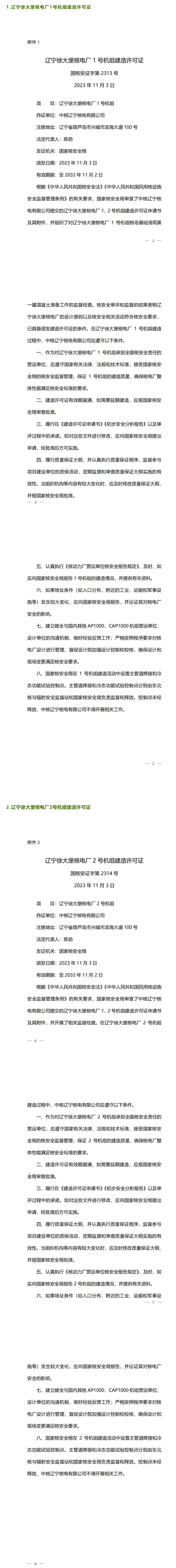 11月6日,生態(tài)環(huán)境部發(fā)布消息稱,國家核安全局決定向中核遼寧核電有限公司頒發(fā)《遼寧徐大堡核電廠1號機組建造許可證》和《遼寧徐大堡核電廠2號機組建造許可證》。