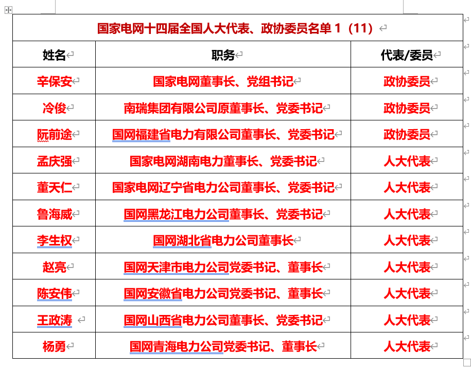 據(jù)初步統(tǒng)計,目前兩大電網(wǎng)的代表、委員有24名,其中國家電網(wǎng)21名,南方電網(wǎng)3名。國家電網(wǎng)、南方電網(wǎng)一把手均當(dāng)選為十四屆全國政協(xié)委員,其他9位省級電力公司一把手或基層員工當(dāng)選了人大代表。據(jù)統(tǒng)計,國家電網(wǎng)、南方電網(wǎng)“兩網(wǎng)”及電力“八大金剛”的代表、委員人數(shù)達(dá)到49人。加上中國能建、中國電建、中國安能、中國電子、中國電氣裝備集團、東方電氣集團、哈電集團、國機集團和貴州能源集團等電力相關(guān)企業(yè)代表、委員人數(shù)11位,合計達(dá)到60位。再加上光伏界8名代表,達(dá)到68位。