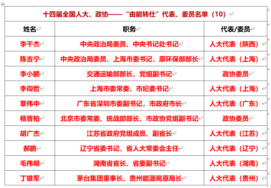 “由能轉(zhuǎn)仕”的十四屆全國人大代表、政協(xié)委員有10人,其中全國人大代表8人,政協(xié)委員2人。如中央政治局委員、中央書記處書記李干杰,曾任生態(tài)環(huán)境部原部長、黨組書記,中央政治局委員、上海市委書記陳吉寧曾任環(huán)保部部長,交通運輸部部長李小鵬曾任中國華能總經(jīng)理,上海市委常委、紀(jì)委書記李仰哲曾任國家能源局副局長,深圳市長覃偉中曾任中國石油副總經(jīng)理,遼寧省委書記郝鵬曾任國務(wù)院國資委主任,江蘇省副省長胡廣杰曾任中國海油副總經(jīng)理,湖南省省長毛偉明曾任國家電網(wǎng)董事長,丁雄軍曾任貴州能源局原局長。