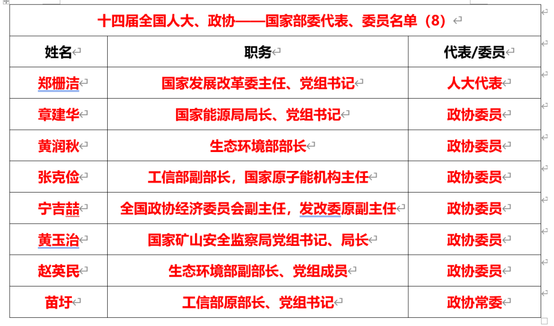 國家部委層面,有國家發(fā)展改革委黨組書記、主任鄭柵潔,生態(tài)環(huán)境部部長黃潤秋,國家能源局局長、黨組書記章建華,國家礦山安全監(jiān)察局黨組書記、局長黃玉治,工信部副部長,國家原子能機構(gòu)主任張克儉,全國政協(xié)經(jīng)濟委員會副主任,生態(tài)環(huán)境部副部長、黨組成員趙英民,國家發(fā)改委原副主任寧吉喆,工信部原部長、黨組書記苗圩8人。