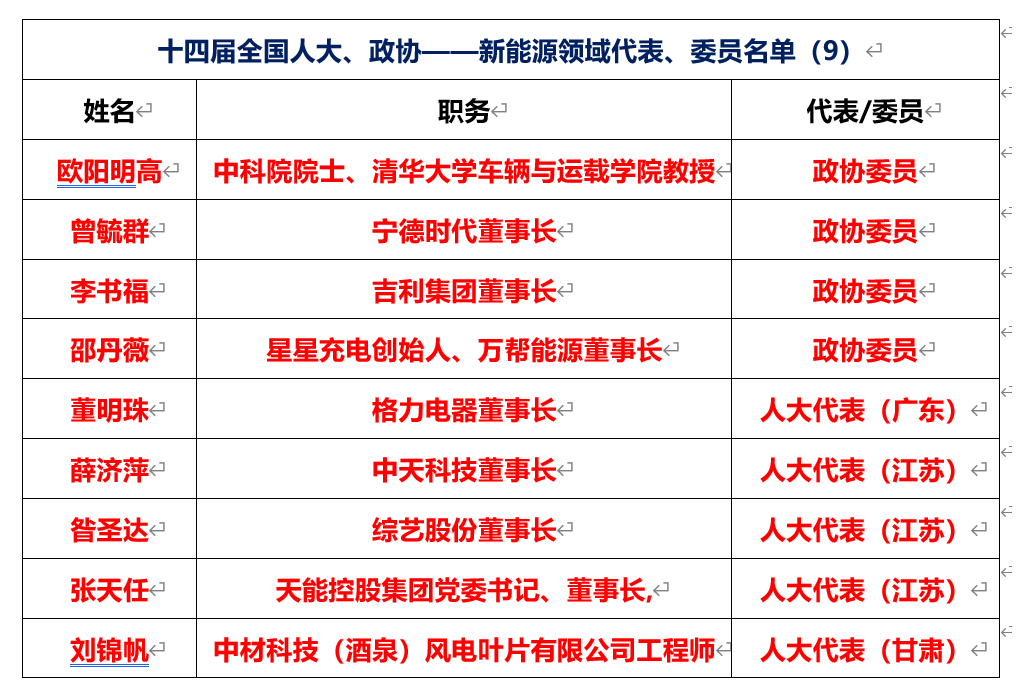 新能源領(lǐng)域有7人當(dāng)選十四屆全國人大代表、政協(xié)委員,格力電器董明珠、寧德時代曾毓群、吉利集團李書福等人當(dāng)選。