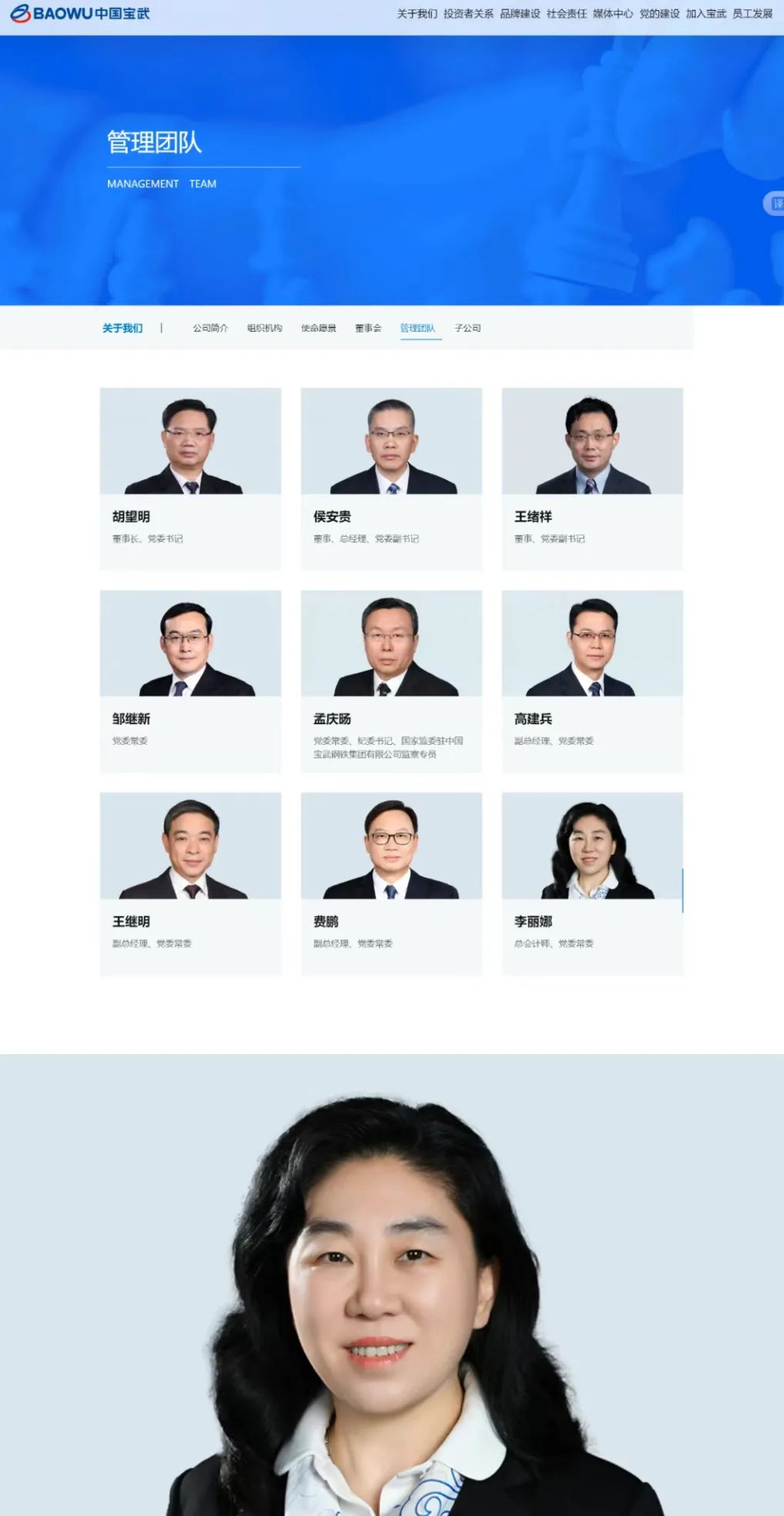 據(jù)中國寶武鋼鐵集團(tuán)有限公司(以下簡稱“寶武鋼鐵集團(tuán)”)官網(wǎng)“管理團(tuán)隊(duì)”欄目最新信息顯示,李麗娜已任集團(tuán)總會(huì)計(jì)師、黨委常委。她此前擔(dān)任中國能源建設(shè)股份有限公司黨委常委、總會(huì)計(jì)師。