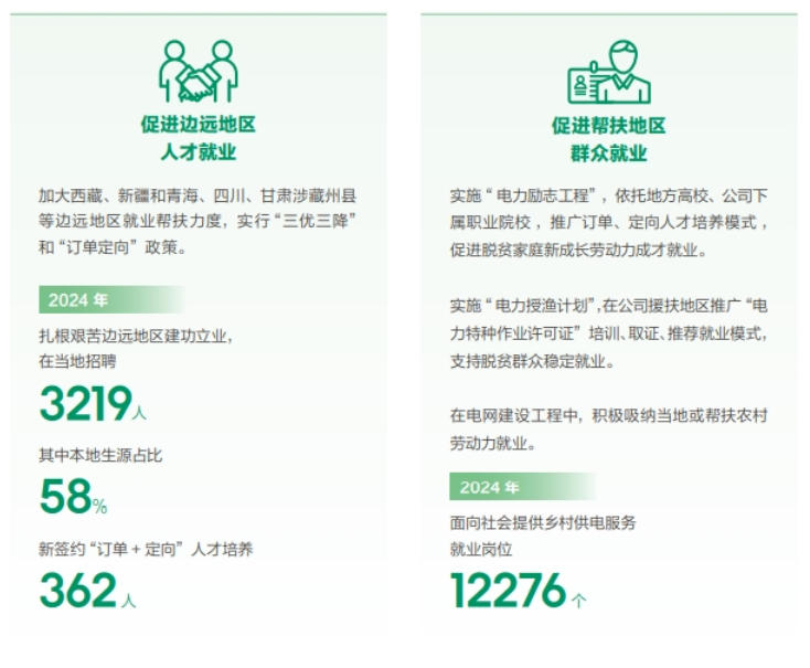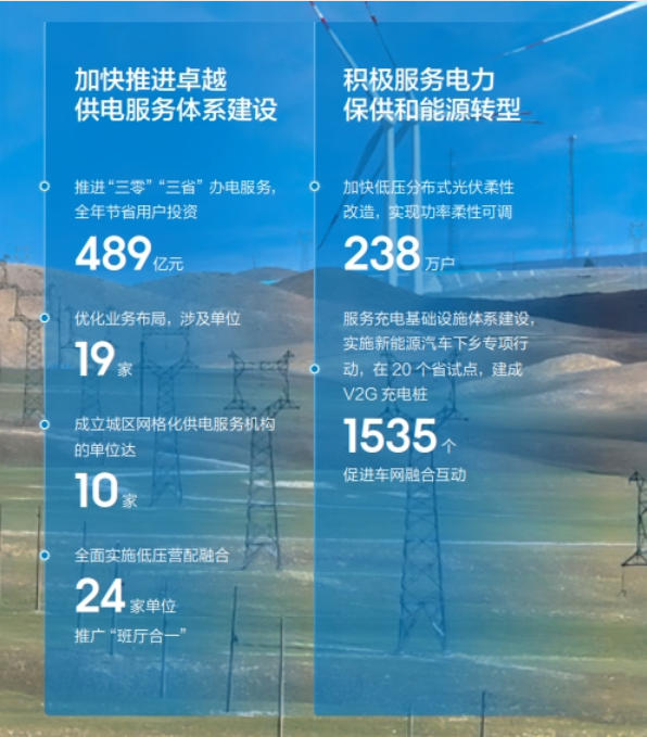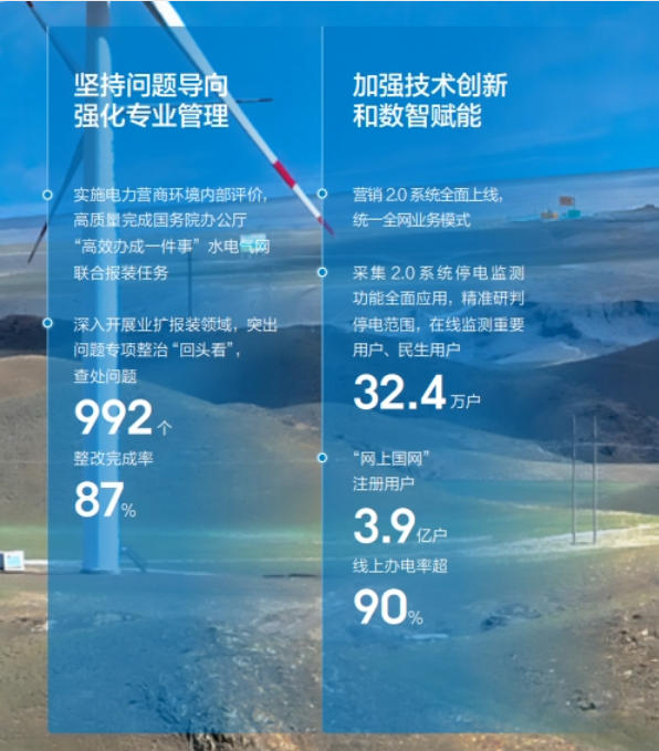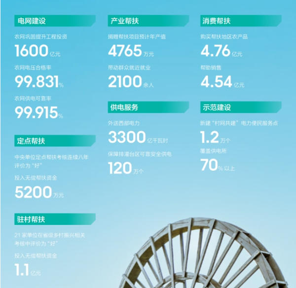 農(nóng)網(wǎng)鞏固提升工程投資1600億元,農(nóng)網(wǎng)電壓合格率99.831%,農(nóng)網(wǎng)供電可靠率99.915%;捐贈(zèng)幫扶項(xiàng)目預(yù)計(jì)年產(chǎn)值4765萬元,帶動(dòng)群眾就近就業(yè)2100余人;投入無償幫扶資金1.1億元。