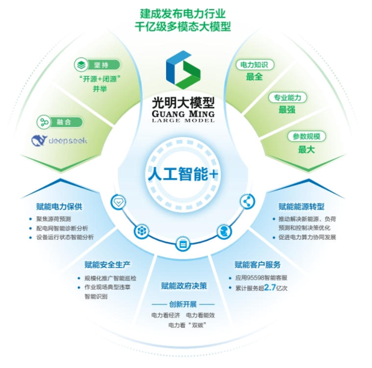 實(shí)施“人工智能+”專項(xiàng)行動(dòng),建成發(fā)布電力行業(yè)千億級(jí)多模態(tài)大模型——光明大模型。