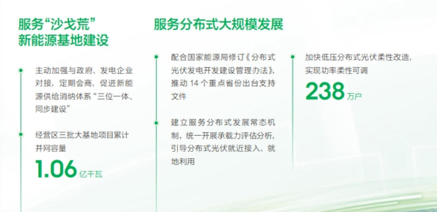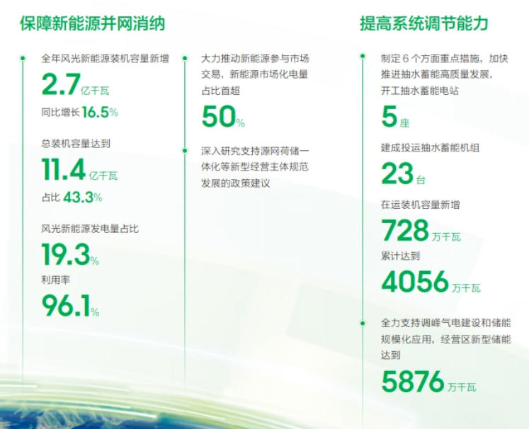 促進(jìn)新能源高質(zhì)量發(fā)展,經(jīng)營(yíng)區(qū)三批大基地項(xiàng)目累計(jì)并網(wǎng)容量1.06億千瓦;加快低壓分布式光伏柔性改造,實(shí)現(xiàn)功率柔性可調(diào)238萬戶;全年風(fēng)光新能源裝機(jī)容量新增2.7億千瓦,同比增長(zhǎng)16.5%;風(fēng)光新能源發(fā)電量占比19.3%,利用率96.1%;開工抽水蓄能電站5座,建成投運(yùn)抽水蓄能機(jī)組23臺(tái),在運(yùn)裝機(jī)容量累計(jì)達(dá)到4056萬千瓦;經(jīng)營(yíng)區(qū)新型儲(chǔ)能達(dá)到5876萬千瓦。