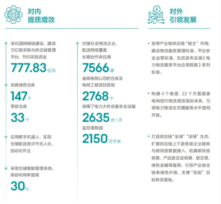 打造綠色數(shù)智供應(yīng)鏈,對(duì)內(nèi)深化國(guó)網(wǎng)綠鏈建設(shè),建成萬億級(jí)采購與供應(yīng)鏈管理平臺(tái),節(jié)約采購資金777.83億元;對(duì)外構(gòu)建4個(gè)維度、22個(gè)方面國(guó)家電網(wǎng)現(xiàn)代物流績(jī)效指標(biāo)體系,引領(lǐng)電力物流生態(tài)圈服務(wù)水平提檔升級(jí)。