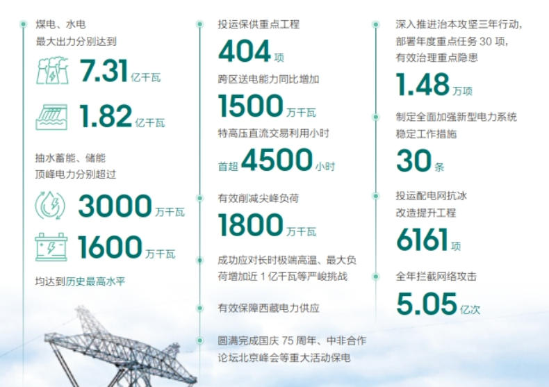 投運(yùn)保供重點(diǎn)工程404項(xiàng)、配電網(wǎng)抗冰改造提升工程6161項(xiàng),攔截網(wǎng)絡(luò)攻擊5.05億次,成功應(yīng)對(duì)長(zhǎng)時(shí)極端高溫、最大負(fù)荷增加近1億千瓦等嚴(yán)峻挑戰(zhàn),解決配電網(wǎng)抗災(zāi)脆弱性問題,消除縣域聯(lián)系薄弱等網(wǎng)架結(jié)構(gòu)短板。