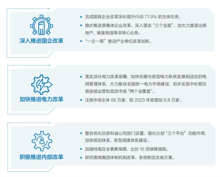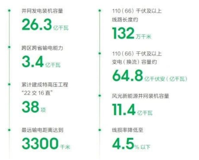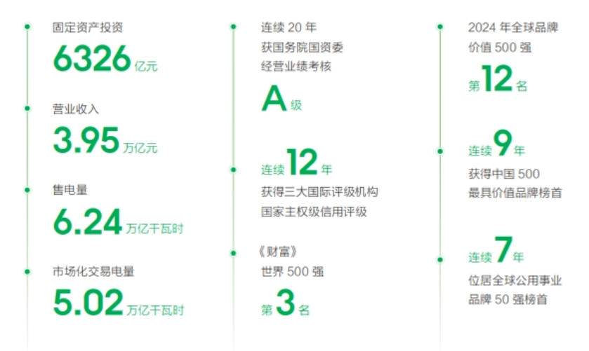 2024年完成固定資產(chǎn)投資6326億元,達(dá)成營(yíng)業(yè)收入3.95萬億元;全年售電量6.24萬億千瓦時(shí),市場(chǎng)化交易電量5.02萬億千瓦時(shí);并網(wǎng)發(fā)電裝機(jī)容量26.3億千瓦,其中風(fēng)光新能源并網(wǎng)裝機(jī)容量11.4億千瓦;累計(jì)建成特高壓工程“22交16直”38項(xiàng),跨區(qū)跨省輸電能力3.4億千瓦,建成全球技術(shù)水平最高、配置資源能力最強(qiáng)、并網(wǎng)裝機(jī)規(guī)模最大、安全運(yùn)行時(shí)間最長(zhǎng)的交直流混聯(lián)特大型電網(wǎng)。