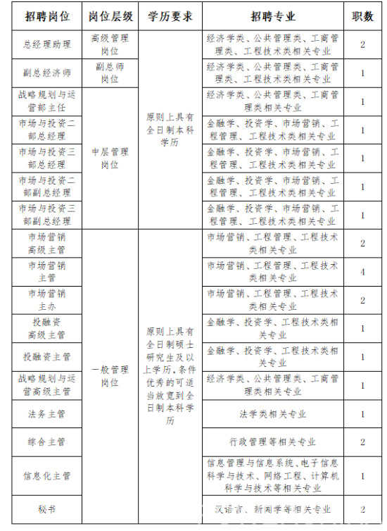 4.主導(dǎo)完成3個(gè)及以上投資金額30億元以上的項(xiàng)目。具備機(jī)關(guān)、事業(yè)單位處級(jí)或國有企業(yè)相對(duì)應(yīng)層級(jí)崗位工作經(jīng)驗(yàn)的優(yōu)先;