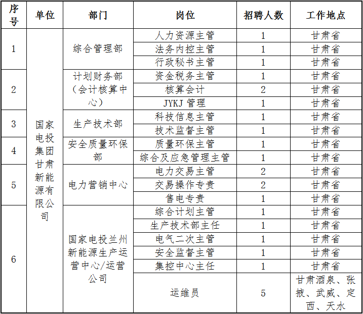 國家電投集團甘肅新能源有限公司(簡稱:國家電投甘肅新能源公司)成立于2016年,是國家電力投資集團有限公司(簡稱:國家電投)在甘肅地區(qū)設(shè)立的新能源投資、開發(fā)、建設(shè)和運營企業(yè),與國家電投甘肅分公司一體化運作。國家電投甘肅分公司為國家電投二級單位,主要承擔(dān)所在地區(qū)區(qū)域規(guī)劃、政府對接、市場開發(fā)、電力營銷、品牌建設(shè)等工作。