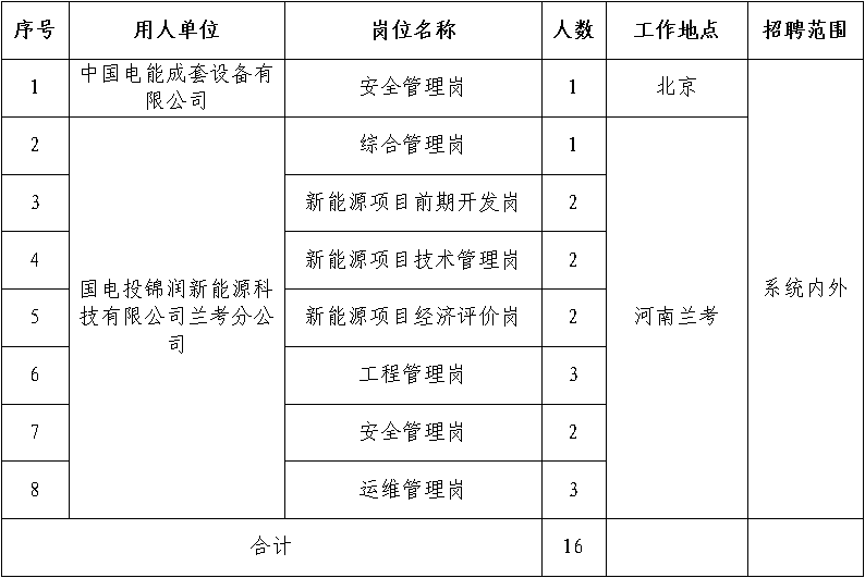 為加快推進(jìn)公司新興產(chǎn)業(yè)落地,保障各項(xiàng)經(jīng)營管理工作有序開展,根據(jù)相關(guān)所屬企業(yè)用人實(shí)際,面向國家電投集團(tuán)系統(tǒng)內(nèi)、外公開選聘專業(yè)技術(shù)人員共16名?,F(xiàn)將有關(guān)事項(xiàng)公告如下: