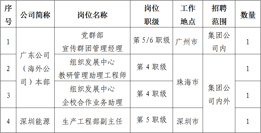 根據(jù)工作需要,依據(jù)公司招聘管理相關(guān)規(guī)定,現(xiàn)對(duì)廣東公司(海外公司)本部及系統(tǒng)內(nèi)部分三級(jí)單位共4個(gè)崗位進(jìn)行公開(kāi)招聘。