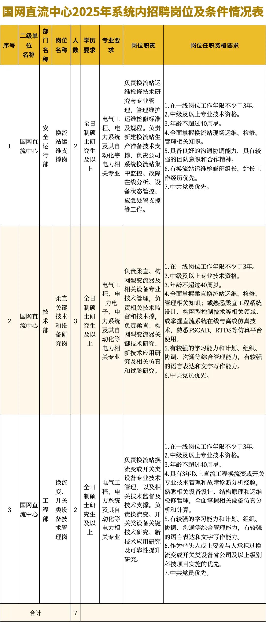 1.國網(wǎng)直流中心2025年系統(tǒng)內(nèi)公開招聘崗位及任職資格情況表
