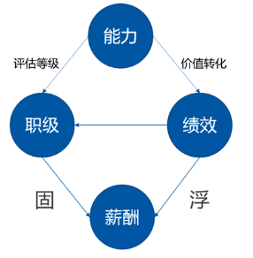 能力的評(píng)估結(jié)果體現(xiàn)為職級(jí),能力的價(jià)值轉(zhuǎn)化體現(xiàn)為績(jī)效。我們根據(jù)能力等級(jí)定薪,通常體現(xiàn)為固定薪酬和目標(biāo)薪酬;為價(jià)值創(chuàng)造付薪,通常體現(xiàn)為浮動(dòng)薪酬和實(shí)際薪酬。這就是我們?nèi)温氋Y格、績(jī)效管理、薪酬管理三大體系之間的關(guān)系。