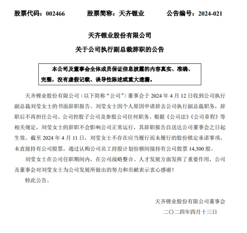天齊鋰業(yè)發(fā)布公告稱,公司董事會于4月12日收到公司執(zhí)行副總裁劉瑩女士的書面辭職報告。劉瑩女士因個人原因申請辭去公司執(zhí)行副總裁職務 ,辭職后不再擔任公司、公司控股子公司及參股公司任何職務。根據(jù)《公司法》《公司章程》等相關規(guī)定,劉瑩女士的辭職不會影響公司正常運行,其辭職報告自送達公司董事會之日起生效。