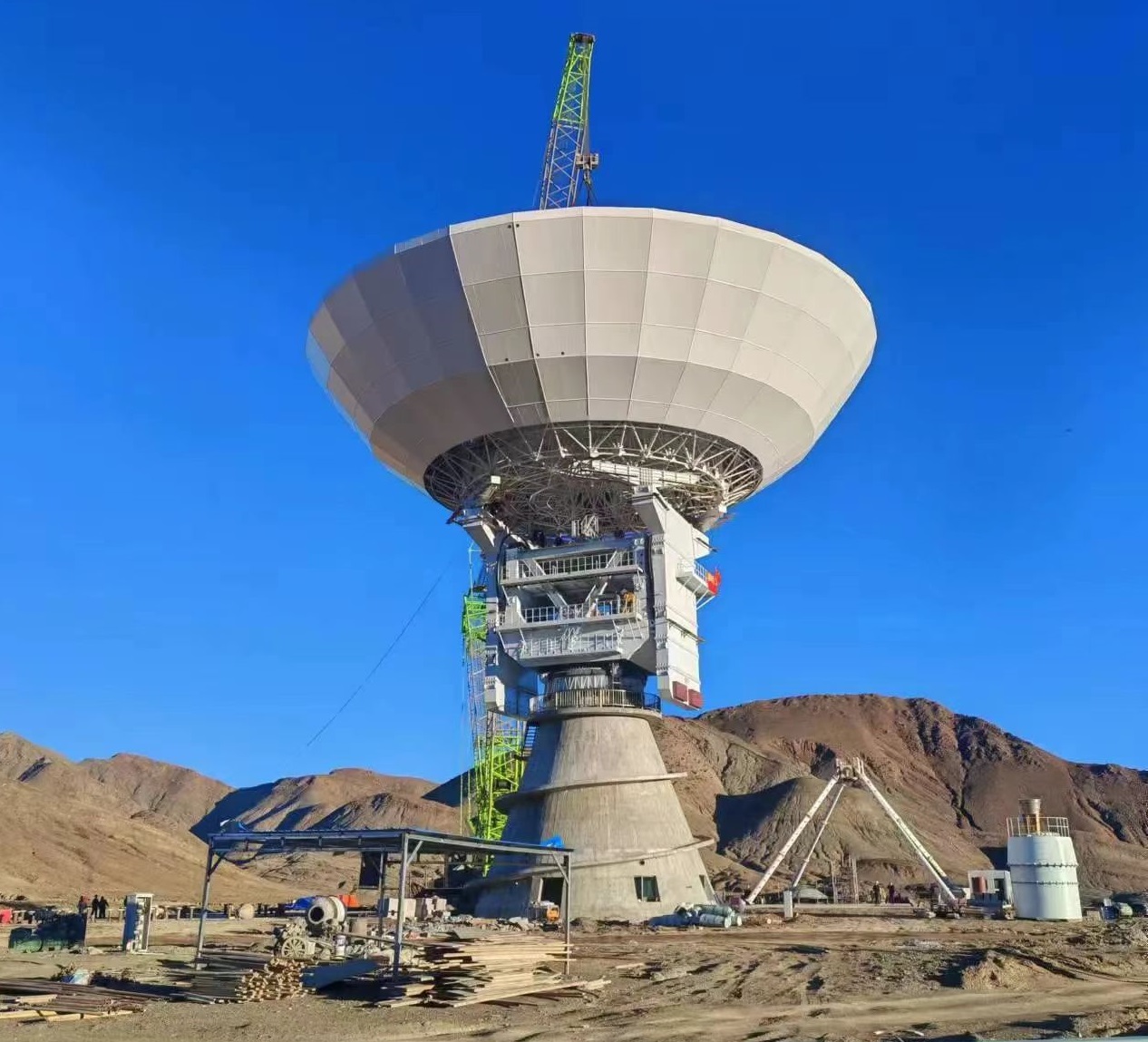 近日,由中國電科與中國科學(xué)院上海天文臺聯(lián)合研制的日喀則40米射電望遠(yuǎn)鏡,在西藏自治區(qū)日喀則市順利完成天線系統(tǒng)主反射體的吊裝,標(biāo)志著天線機(jī)械架設(shè)初步完成,為后續(xù)望遠(yuǎn)鏡電氣調(diào)試等聯(lián)調(diào)奠定堅(jiān)實(shí)基礎(chǔ)。