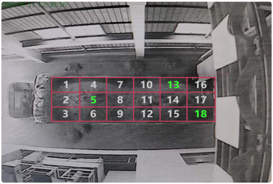 通過攝像頭的實時畫面,基于深度學(xué)習(xí)物體檢測車輛,捕捉貨車車廂上頂蓋平面,用線條等分,繪制18個子采樣區(qū)域,并對子區(qū)域進(jìn)行編號,直觀展示采樣分布。